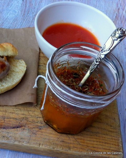 En una procesadora trituras 1 cucharada sopera rasa de: orégano, perejil, romero , pimentón dulce y vinagre junto con dos guindillas, 1 diente de ajo, 3 cucharadas de aceite de oliva y un poco de sal. Puedes rectificar cualquiera de los ingredientes en función de tus gustos.