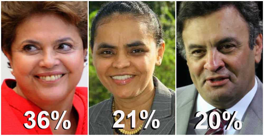 Según la encuesta del Instituto Datafolha, Rousseff, sigue en primer lugar con un 36% de los votos, Silva sube al segundo puesto, con un 21%, en un empate técnico con Neves, que mantiene su 20%, pero que pierde la buena ventaja de 11 puntos, que tenía antes sobre Campos. En una simulación de segunda vuelta, Silva empata técnicamente con Rousseff pero se coloca a la cabeza, con un 47% contra 43%.