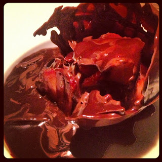 Para intentar aplacar la envidia de lo inalcanzable que esa cava despertaba en mi, me dediqué a dar cuenta del postre; una esfera de chocolate, rellena de frutos del bosque y mouse de chocolate que se derritió ante el baño de chocolate amargo caliente que el mozo vertió por encima al momento de servirlo.